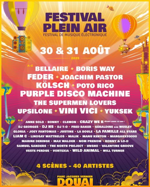 Le Festival Plein Air revient les samedi 30 et dimanche 31 août 2025 au Parc Jacques Vernier de Douai pour célébrer la fin de l'été au rythme de l'électro.
