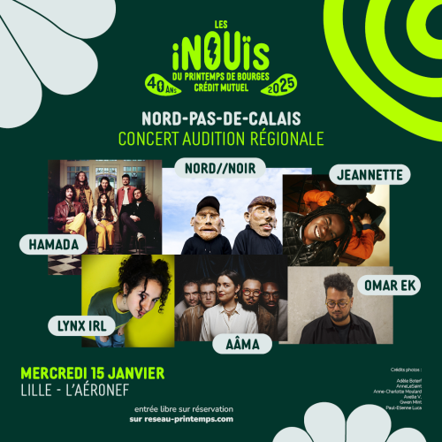 Venez découvrir et encourager les artiste présélectionné·es pour Les iNOUïS du Printemps de Bourges Crédit Mutuel 2025 lors de la première audition régionale de l'antenne Nord-Pas-De-Calais à l'Aéronef.