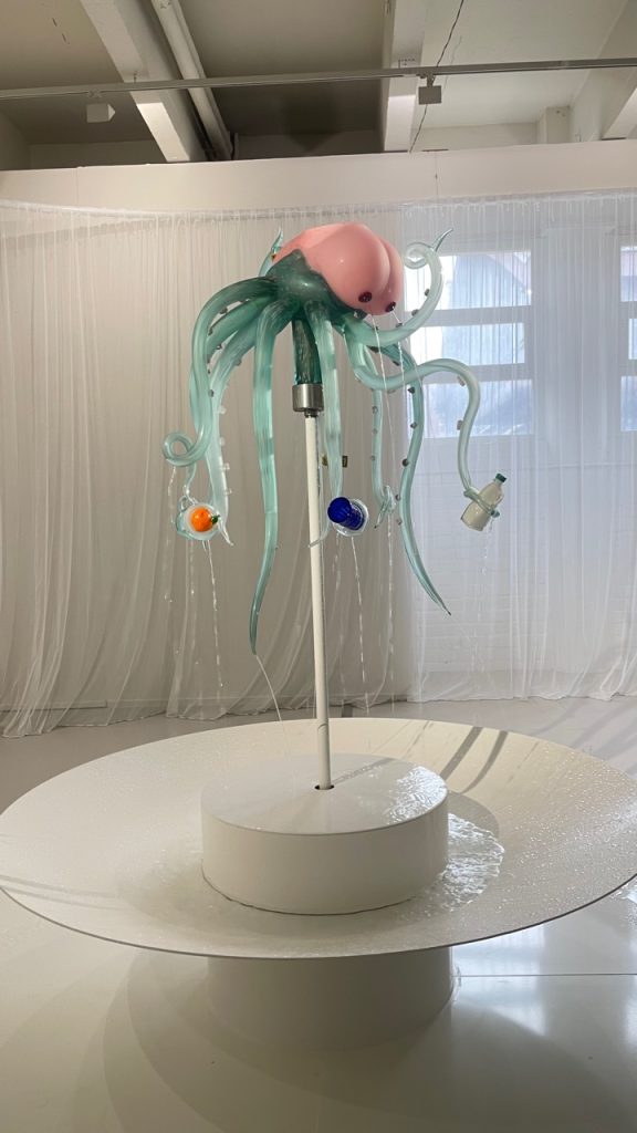 Au bout des tentacules, des objets du quotidien en verre soufflé prennent place, pour appuyer le langage ludique de l'artiste et son abécédaire imaginaire.