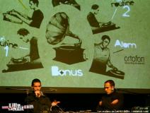 L'après midi a débuté avec l'intervention de Greem et 20syl, membres de Hocus Pocus, groupe de hip hop Nantais. Les deux énergumènes sont également membres de Coup 2 Cross, collectif de Djs vainqueur du DMC 2006. Des professeurs plus que calés sur le sujet et qui ont su rester simples dans leurs propos. Petit point historique, exemples concrets et démonstrations. On touche avec les yeux, pas le droit de manipuler! Mais l'intervention était suffisante et bien menée pour une première approche, face à un jeune public un peu dissipé qui s'impatientait de prendre la place des intervenants!